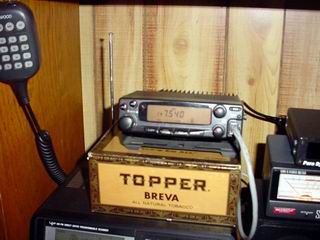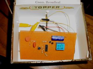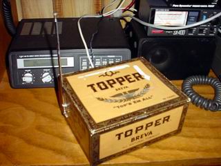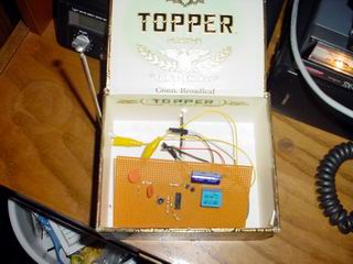 ![]() Underneath the TM-251a (above) Here the outboard detector circuitry and antenna sit underneath the 2m radio. The antenna can be seen at the left of the cigar box. I've temporarily put the circuit board into the box until I can get a better enclosure. (left) Just a larger picture of the box itself without the radio on top. |